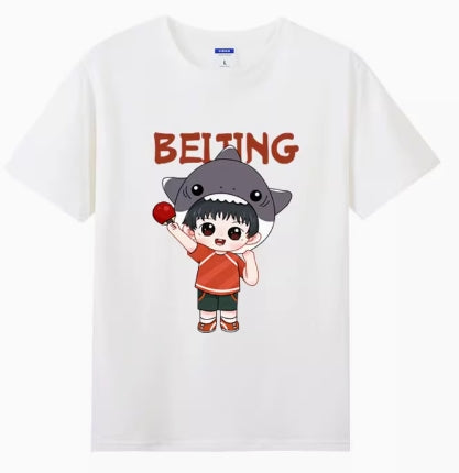 This white kids' short-sleeve T-shirt is made from high-quality pure cotton, offering softness and breathability for comfortable summer wear. The vibrant front print features a playful cartoon character—a boy wearing a shark hat, dressed in a bold red top and green shorts, holding a red ball with a cheerful expression. The design is highlighted by striking red "BEIJING" lettering, blending urban style with childlike fun.