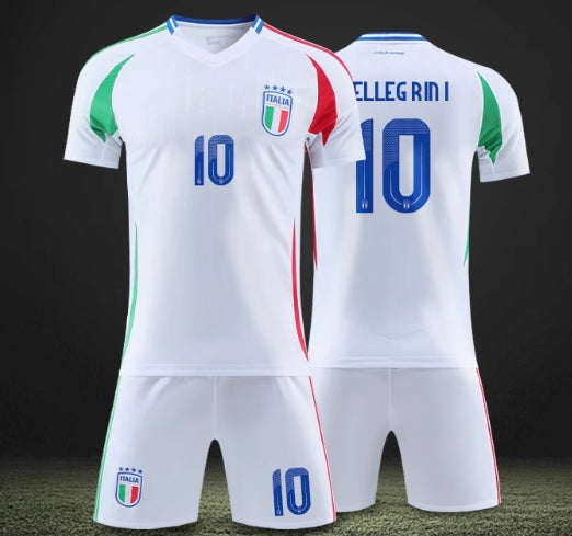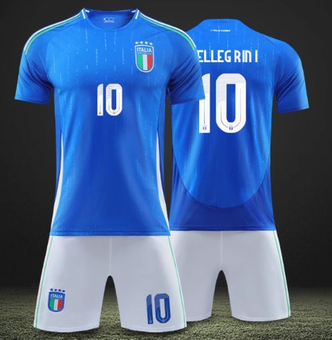 This set includes the blue jersey and white shorts officially licensed by the Italian national team. The jersey is printed with the Italian flag and player numbers, showing the pure national team style. The high-quality fabric is suitable for competitions and daily training, and is also suitable for fans to collect, showing your love and support for Italian football. Exquisite details and comfortable to wear, it is a rare choice for your football equipment